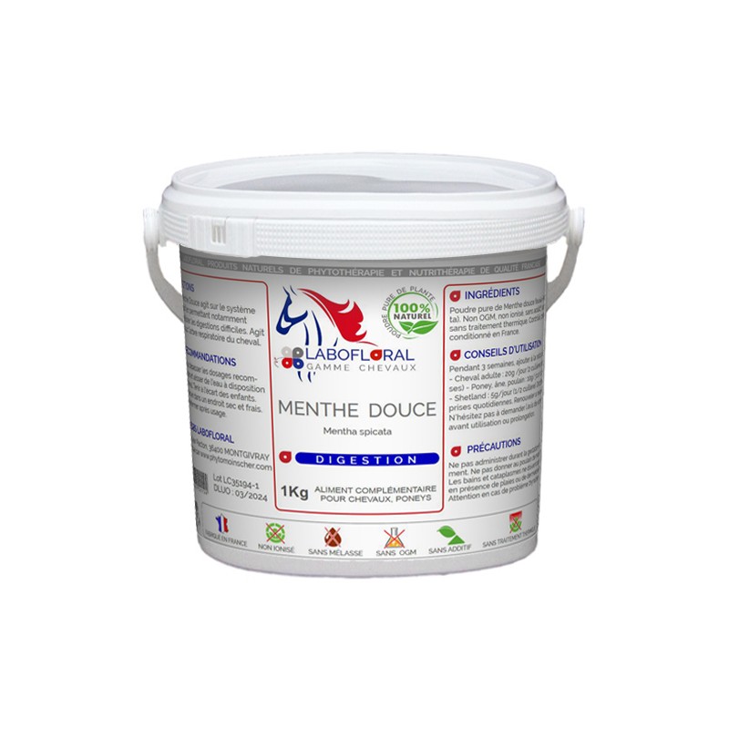 Comme toutes les Menthes, la Menthe Douce possède une action sur le système digestif. Elle peut permettre notamment d’améliorer les digestions difficiles. Elle intervient également sur l'arbre respiratoire du cheval.